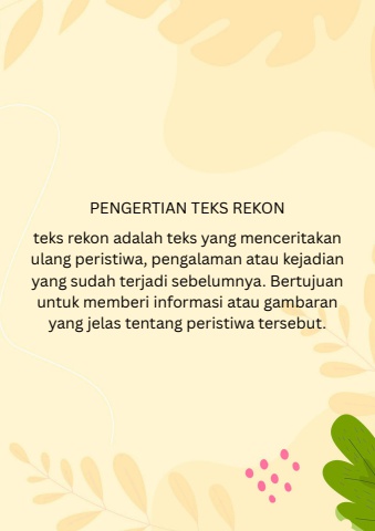 teks rekon adalah teks yang menceritakanulang peristiwa, pengalaman atau kejadianyang sudah terjadi sebelumnya. Bertujuanuntuk memberi informasi atau gambaranyang jelas tentang peristiwa tersebut.PENGERTIAN TEKS REKON